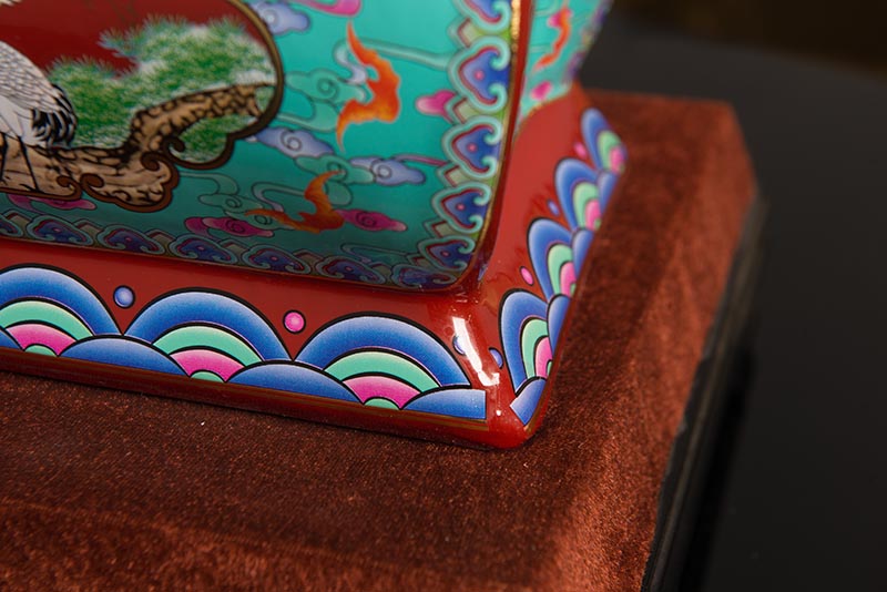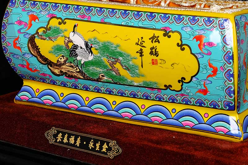 這一款產(chǎn)品采用的是景德鎮(zhèn)獨(dú)特工藝粉彩工藝,色彩鮮明,呈色自然。原料用的是 “高嶺土”一種特別土礦資源,“高嶺土”又有高齡之意,與我們產(chǎn)品【仙鶴年年】相得益彰,本款產(chǎn)品運(yùn)用了仙鶴、松樹、松鶴延年則寓延年益壽或?yàn)橹竟?jié)清高之意。  尺寸:345x200x240mm